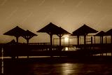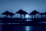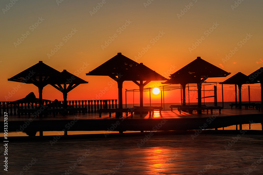 Luxury swimming pool with sea view at sunrise. Concept of rest, relaxation, holidays, resort