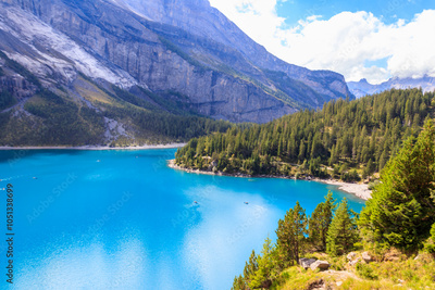 View of Oeschinen lake (Oeschinensee) and Swiss Alps near Kandersteg in Bernese Oberland, Switzerland