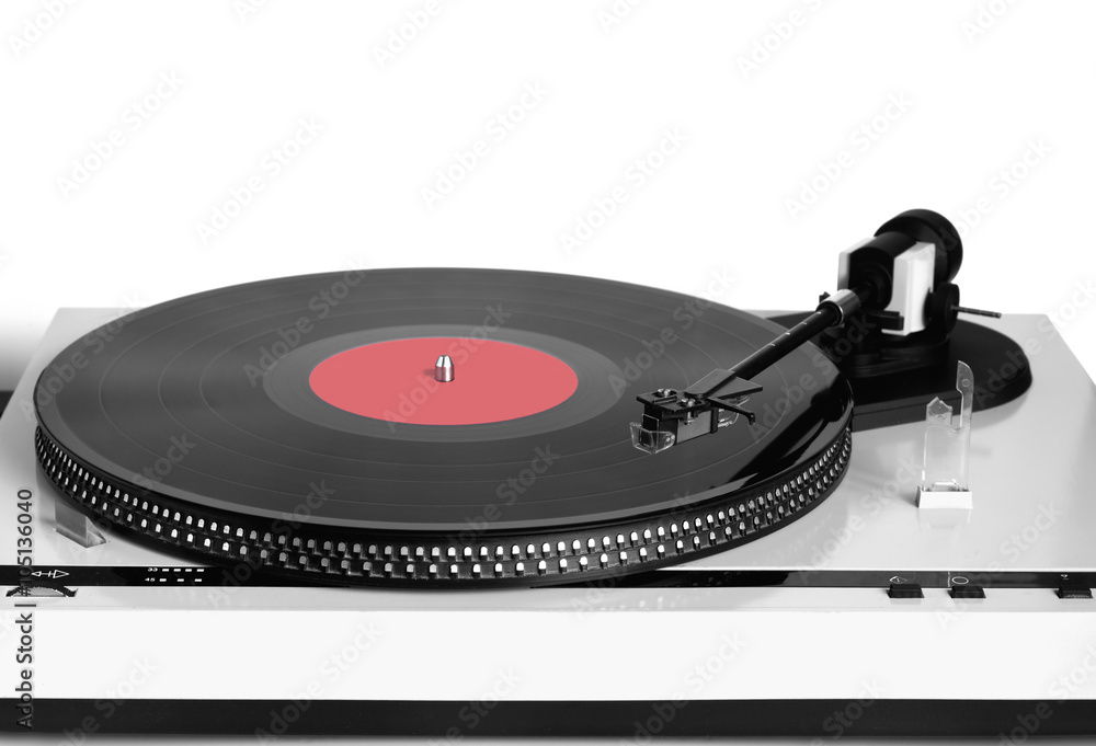 Modern turntable in silver case with rotation vinyl record with red label isolated on white background. Horizontal photo front view closeup