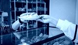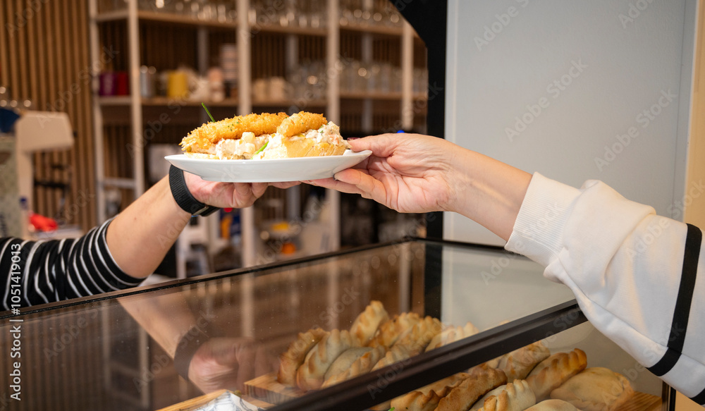 close-up of hands receiving a plate of tapas over the food counter, in a restaurant.
