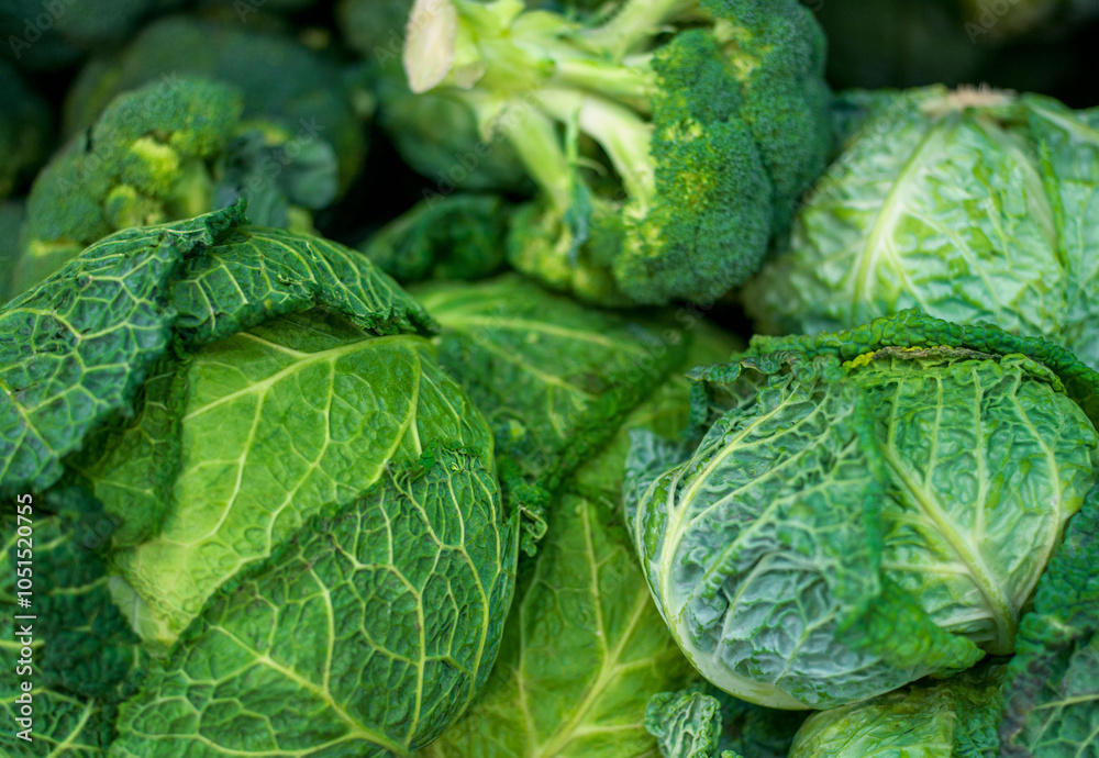 Raw green cabbage, broccoli, organic food concept made of green vegetables