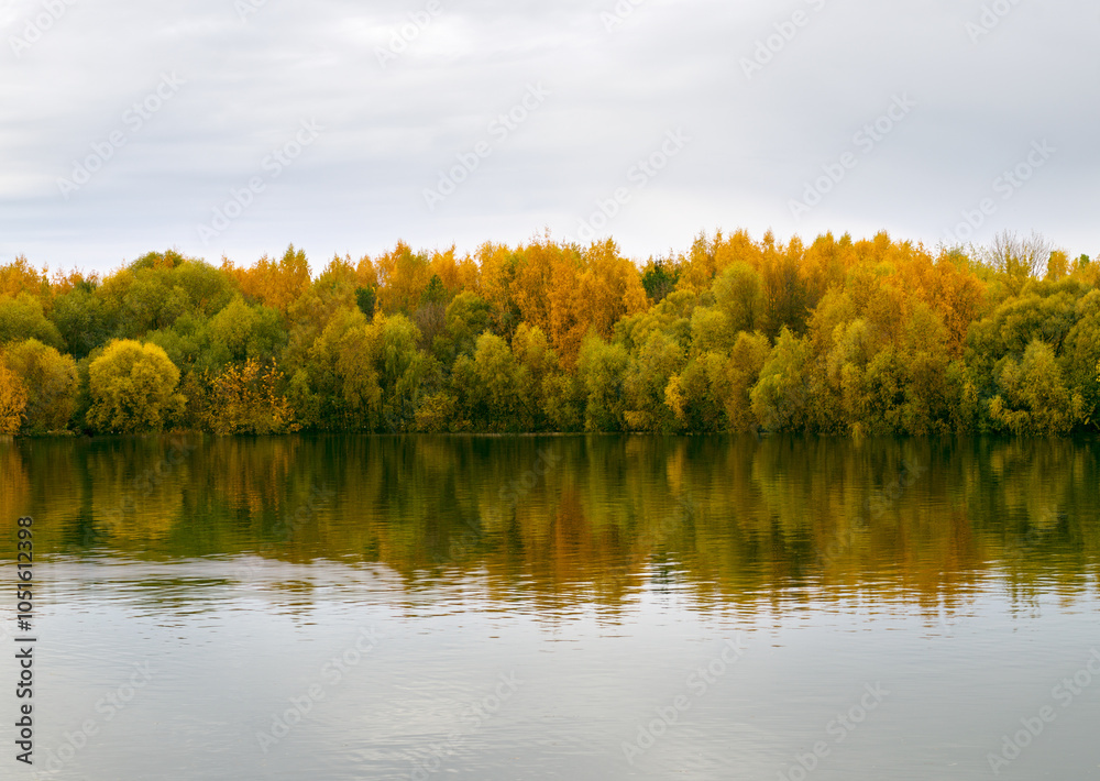 Colorful yellow foliage tree reflections in calm water on a autumn day landscape