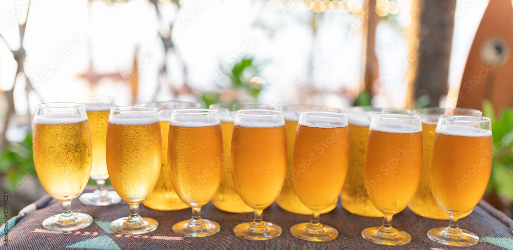 Beer in glasswares which are prepared for the party event. Refreshment drinking, close-up and selective focus.