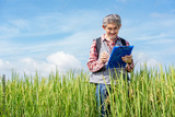 portrait agronomist or researcher writing paperwork on clipboard while examining rice plant in paddy field,rice research,rice agriculture development