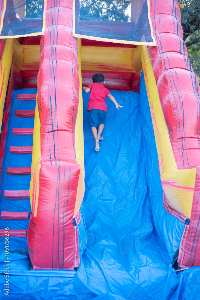 Rear view Asian toddler boy in red shirt climbing up slide of inflatable bounce house jumping castle, climber wall bouncer carnival game in Dallas, Texas, air bouncing house outdoor party event