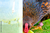 Closeup of a young hen seen at her drinking station in a free range English garden. Part of a small free range flock kept for there tasty eggs.