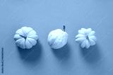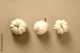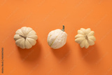 Autumn three white pumpkins on orange background. Seasonal harvest and healthy organic food. Thanksgiving Day. View from above.
