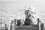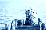 Boy fishes on a bridge on the lake