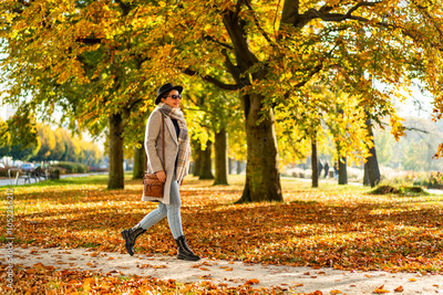Beautiful young woman wearing jeans, gray coat, checkered warm scarf, black brimmed hat and sunglasses walking along path in city park on sunny autumn day. Side view