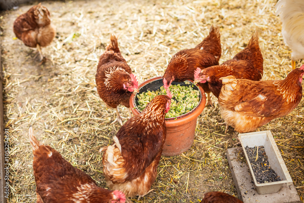 Feeding hens with grains and vegetable and greens. Natural organic farming concept.