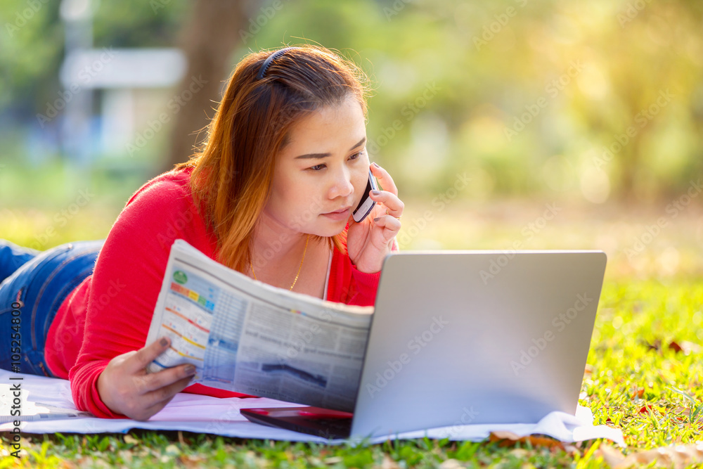 Business asian woman reading newspaper and working with laptop on the grass in park and talking on a phone