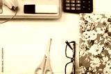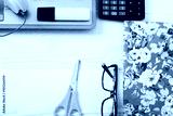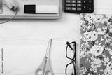 Creative workspace with work accessories and copy space on wooden table. Top view