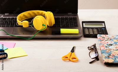 Workspace with teenage accessories and computer. Selective focus