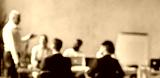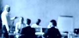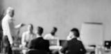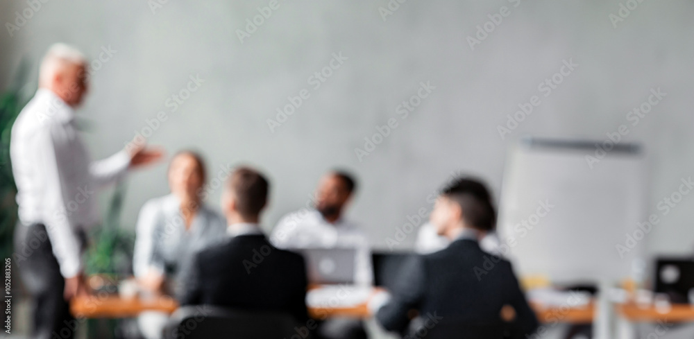 Business Meeting, Blurred Background. Ceo Businessman Giving Speech During Corporate Meeting With Employees In Modern Office.