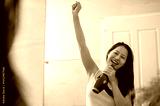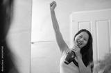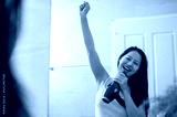 A cheerful Asian woman is enjoying singing in the bathroom while using a hair dryer as a microphone.