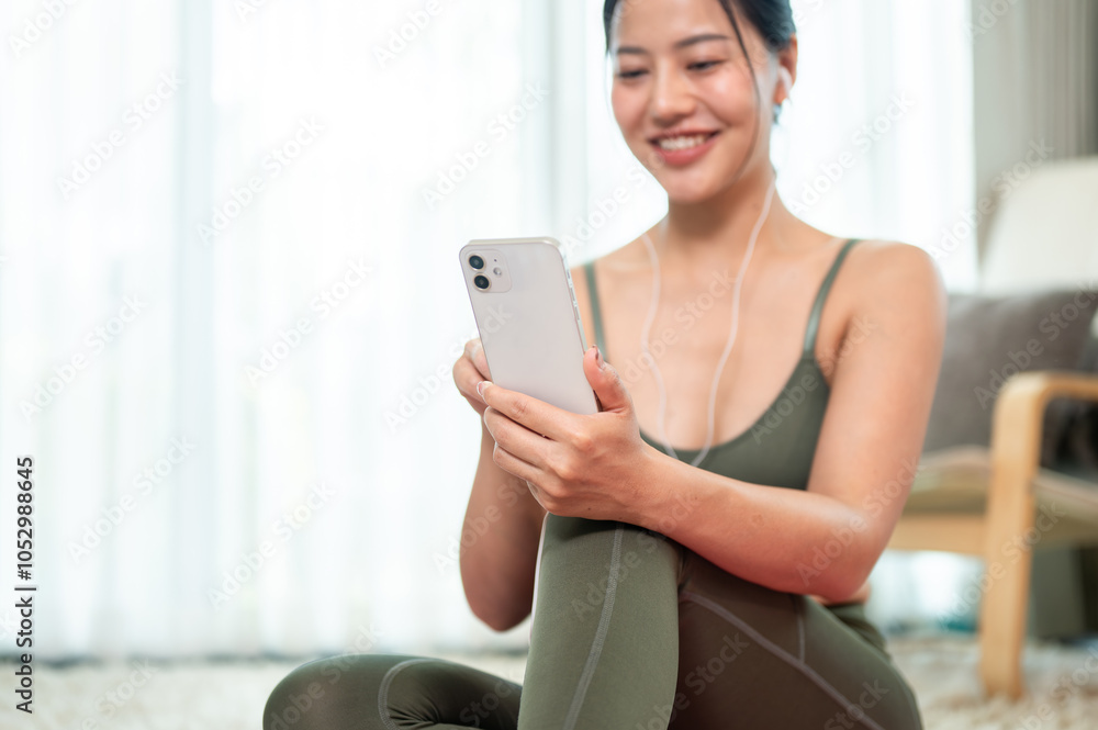 A beautiful, positive Asian woman in sportswear is resting on a yoga mat after her workout at home.