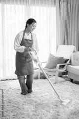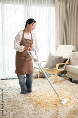 A beautiful Asian woman is cleaning a carpet with a vacuum cleaner in the living room at home.