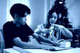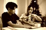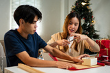 A young man and woman are happily wrapping gifts at a table, sharing a fun moment together. They are surrounded by holiday decorations, with a Christmas tree adding to the festive ambiance