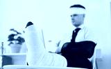 Close up shot of foot of a handicapped business man with broken leg and arm in bandage working from home during rehabilitation. Disabled guy with plastered leg and immobilizer on injured arm.