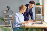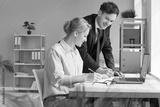Enthusiastic and positive business colleagues working together with laptop and engaged in paperwork during a meeting and discussion in the office. Their teamwork and collaboration are key to success.