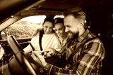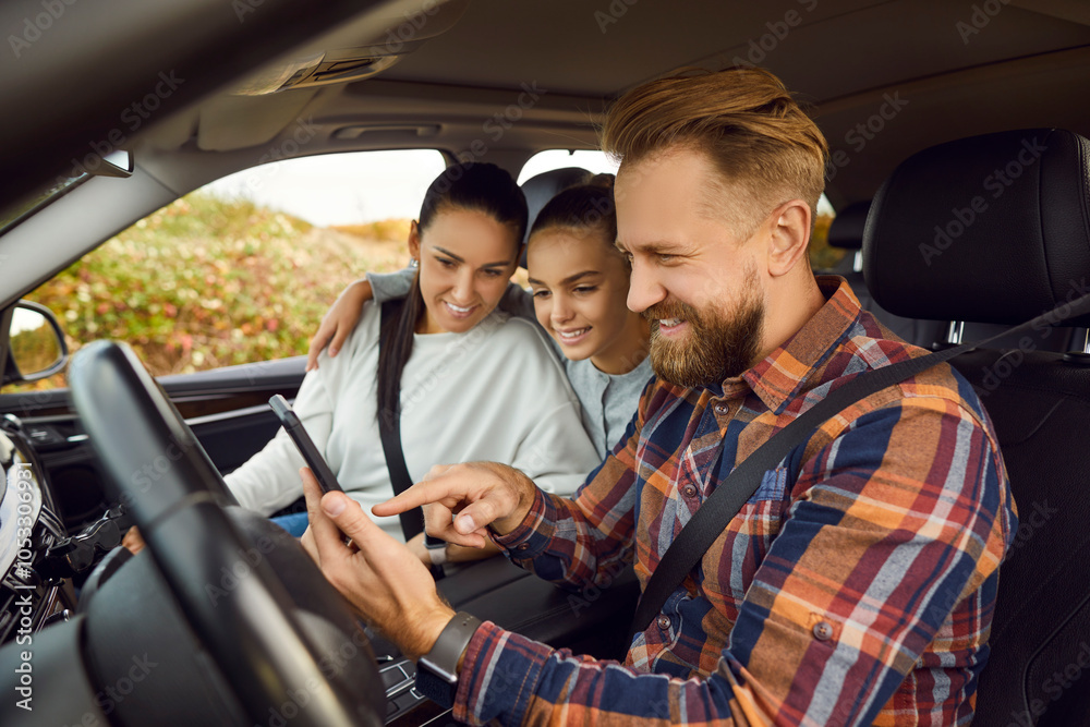 Happy smiling family with child girl sitting inside car with father using digital map application in his mobile phone showing way. Road trip, adventure and family vacation concept.