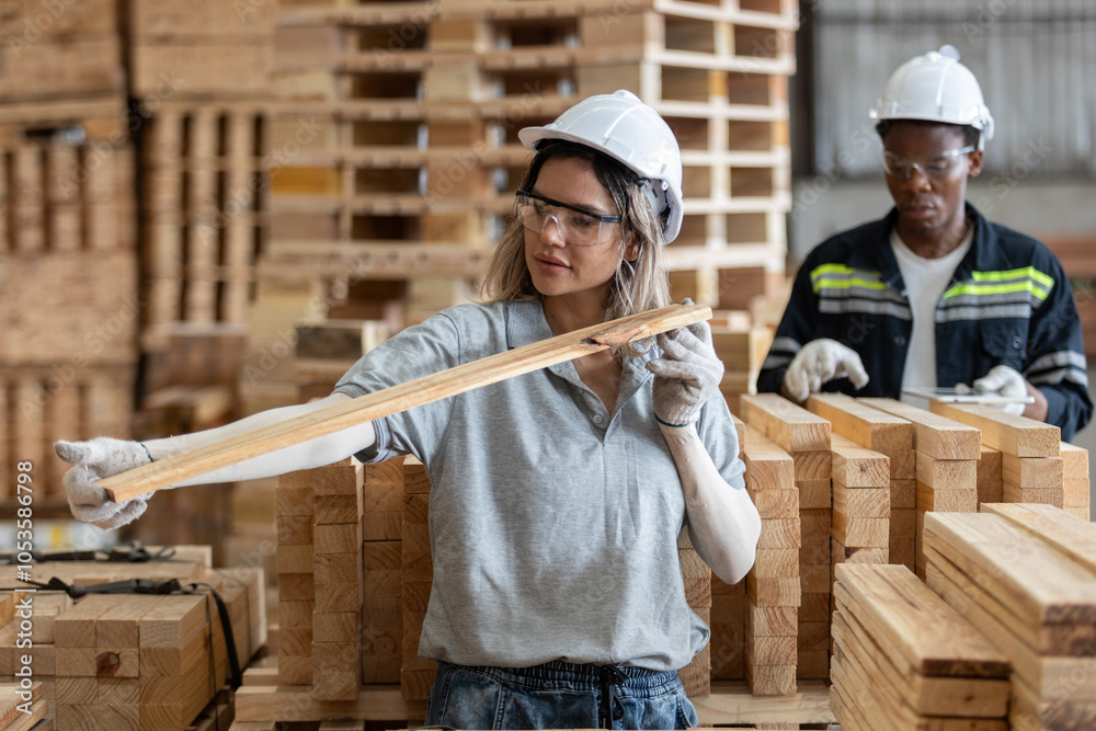 woman wearing safety uniform and hard hat working quality inspection of wooden products at workshop manufacturing wooden. female carpenter worker wood warehouse industry.