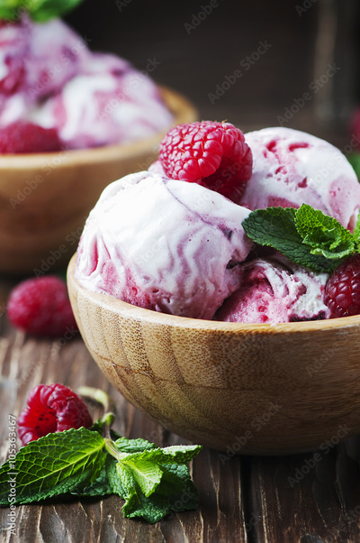 Sweet ice-cream witn mint and raspberry