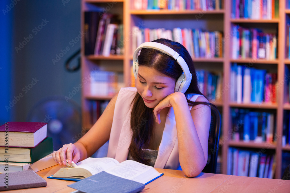 woman wear headphone reading education with books study and research in library. student learning information thinking in university.