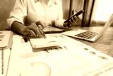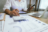 Businessman or accountant is analyzing data charts, graphs and dashboards on laptop screen to prepare statistical report.