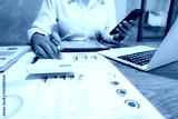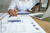 Businessman or accountant is analyzing data charts, graphs and dashboards on laptop screen to prepare statistical report.