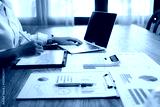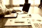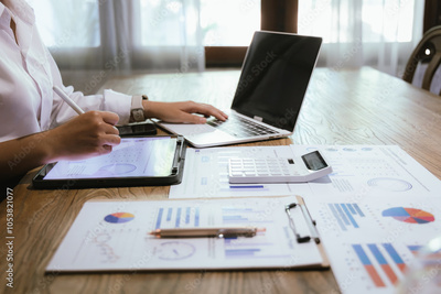 Businessman or accountant is analyzing data charts, graphs and dashboards on laptop screen to prepare statistical report.