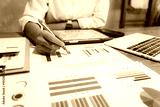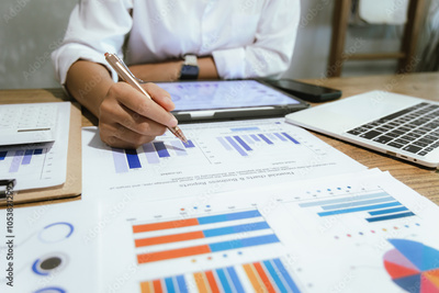 Businessman or accountant is analyzing data charts, graphs and dashboards on laptop screen to prepare statistical report.