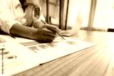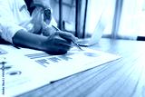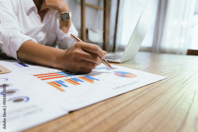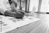 Businessman or accountant is analyzing data charts, graphs and dashboards on laptop screen to prepare statistical report.
