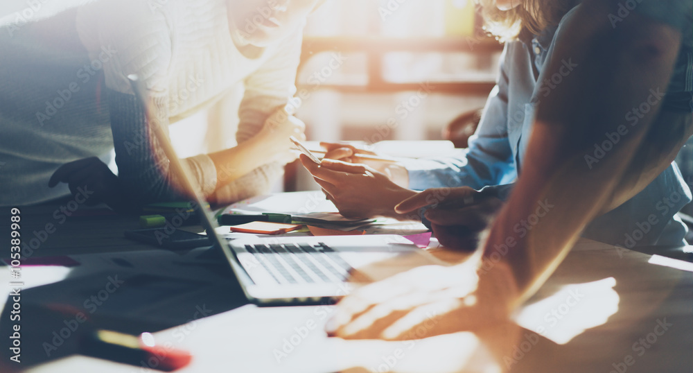 Team brainstorming. Photo young creative managers crew working with new startup project in modern office. Generic design notebook on wood table. Horizontal, sunset effect