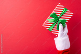 A Santa Claus gloved hand holding a beautifully wrapped Christmas gift with green ribbon against a red background, evoking holiday cheer and festive spirit