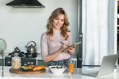 Smiling Caucasian woman with blond hair casual outfit having healthy breakfast while writing recipe making notes to do list working remotely using laptop standing in the cozy kitchen
