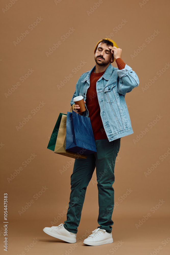 Studio shot of forgetful man with shopping bags and takeaway coffee.