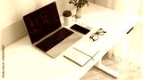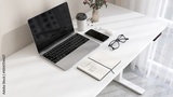 Desktop of modern white stand up desk with laptop computer, smartphone, earphone, notebook and eyeglasses in sunlight from curtain window on beige wall for home office working, product background 3D