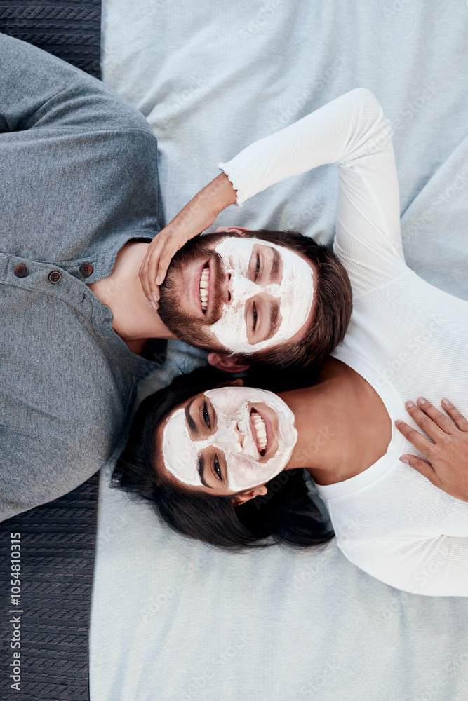 Skincare, love and face mask with portrait of couple from above for beauty, cosmetics and diy spa treatment. Wellness, collagen and detox facial with man and woman in bedroom at home for self care