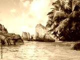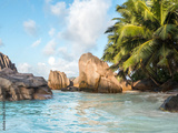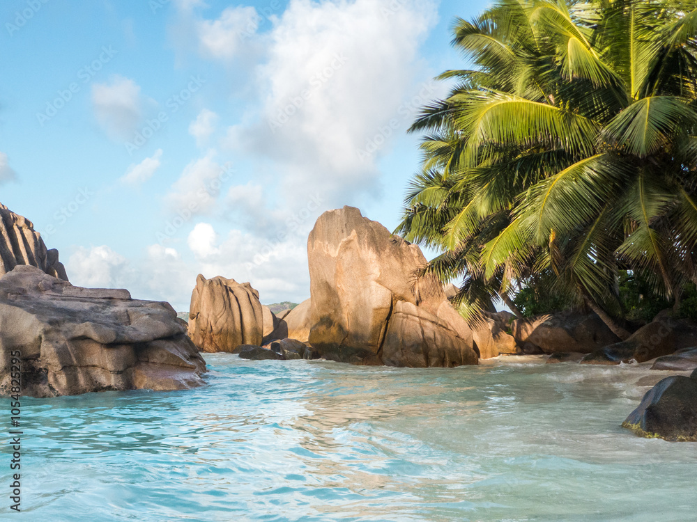 Stunning views of empty beaches of the wonderful islands of Seychelles. Beautiful landmark. Clear, sunny day, warm sunlight. No people, outdoors. Concept of leisure and travel
