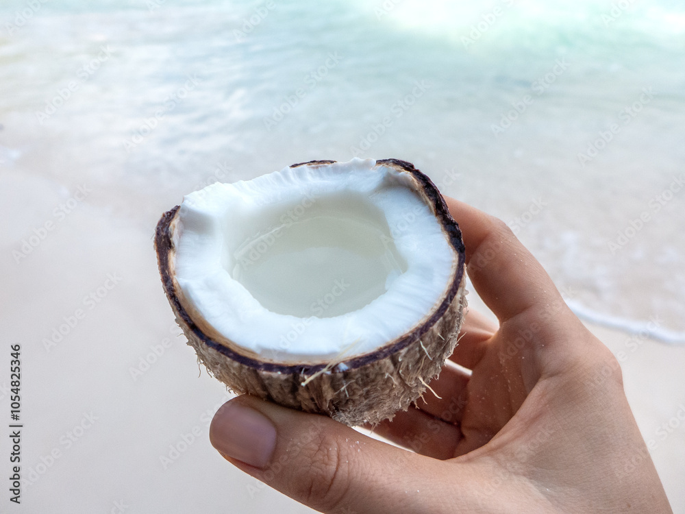 Cute woman holding coconut on stunning white sand beach. Clear, sunny day. Outdoors. Concept of leisure, travel and healthy food concept