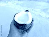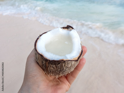 Cute woman holding coconut on stunning white sand beach. Clear, sunny day. Outdoors. Concept of leisure, travel and healthy food concept