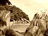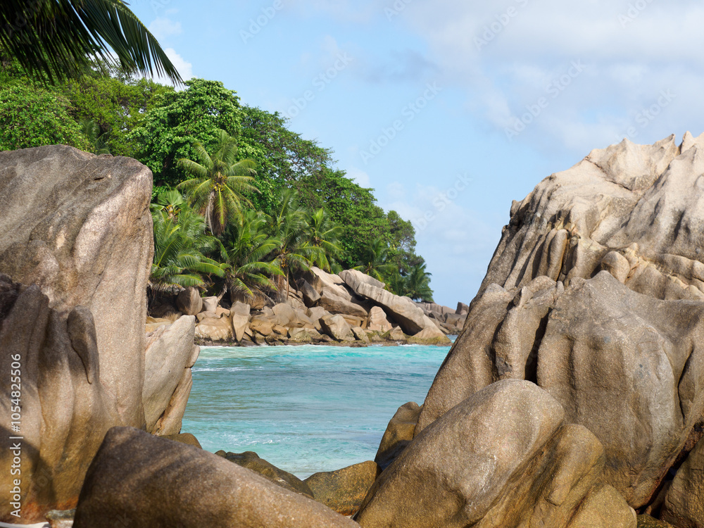 Stunning views of empty beaches of the wonderful islands of Seychelles. Beautiful landmark. Clear, sunny day, warm sunlight. No people, outdoors. Concept of leisure and travel