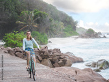 Cute woman with vintage bicycle on the background of stunning white sand beach with palm trees and rocks. Beautiful views and sights of Seychelles. Clear, sunny day. Concept of leisure and travel
