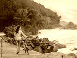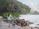 Cute woman with vintage bicycle on the background of stunning white sand beach with palm trees and rocks. Beautiful views and sights of Seychelles. Clear, sunny day. Concept of leisure and travel