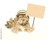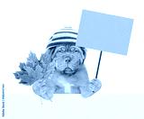 Sad Mastiff puppy wearing warm hat with pompon holds dry colorful leaves, looks above empty banner and shows blank placard. isolated on white background