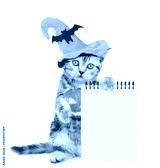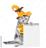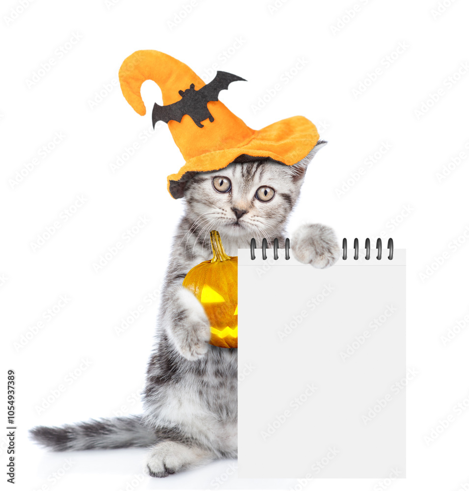 Cute Kitten with hat for halloween holds pumpkin and shows blank notepad. Empty space for text. isolated on white background