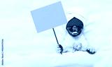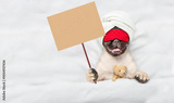 Pug puppy wearing sleeping mask and towel sleeps with toy bear under white blanket on a bed at home and shows blank placard. Top down view
