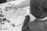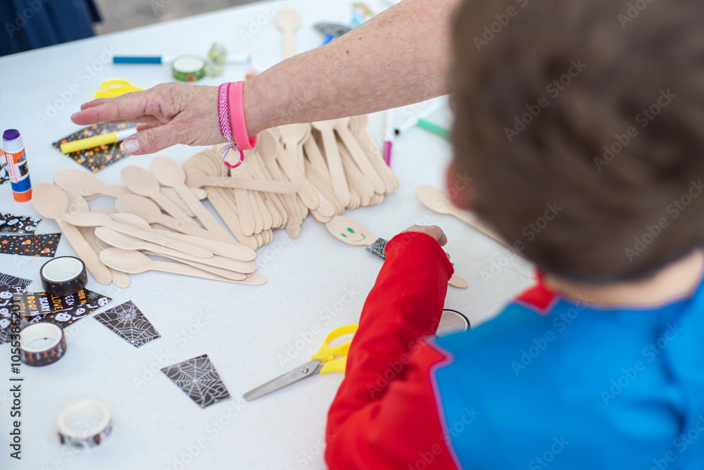 Caucasian family in Halloween costume making crafts with wooden spoon, various supplies at outdoor event table in Farmers Branch, TX, Do It Yourself holiday gifts toys decoration artist tradition