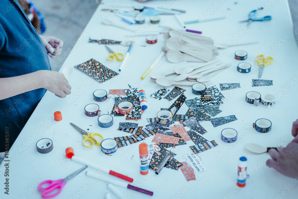 Halloween craft table full of supplies including small scissors, wooden spoons, tapes, color pens, glue, papers at outdoor event in Farmers Branch, TX, Do It Yourself holiday gifts toys tradition